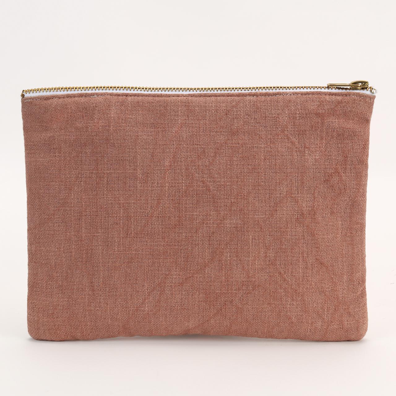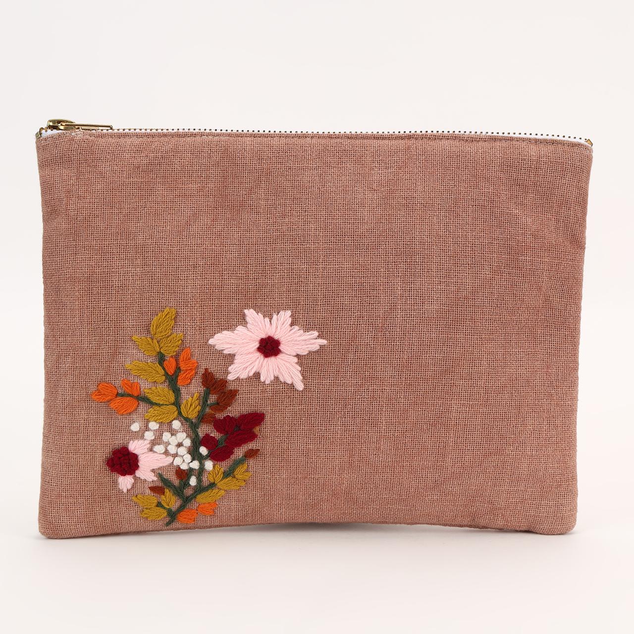 This pouch features a soft, earthy brown fabric adorned with delicate floral embroidery in vibrant hues of pink, orange, and red. The intricate hand-embroidered design adds an elegant touch, making it a perfect blend of minimalism and artistry. Compact and stylish, it is ideal for storing essentials such as cosmetics, stationery, or small personal items. Its sturdy zipper ensures security, while the textured fabric offers a comfortable, rustic charm. A versatile piece, it can seamlessly complement any outfit or occasion.