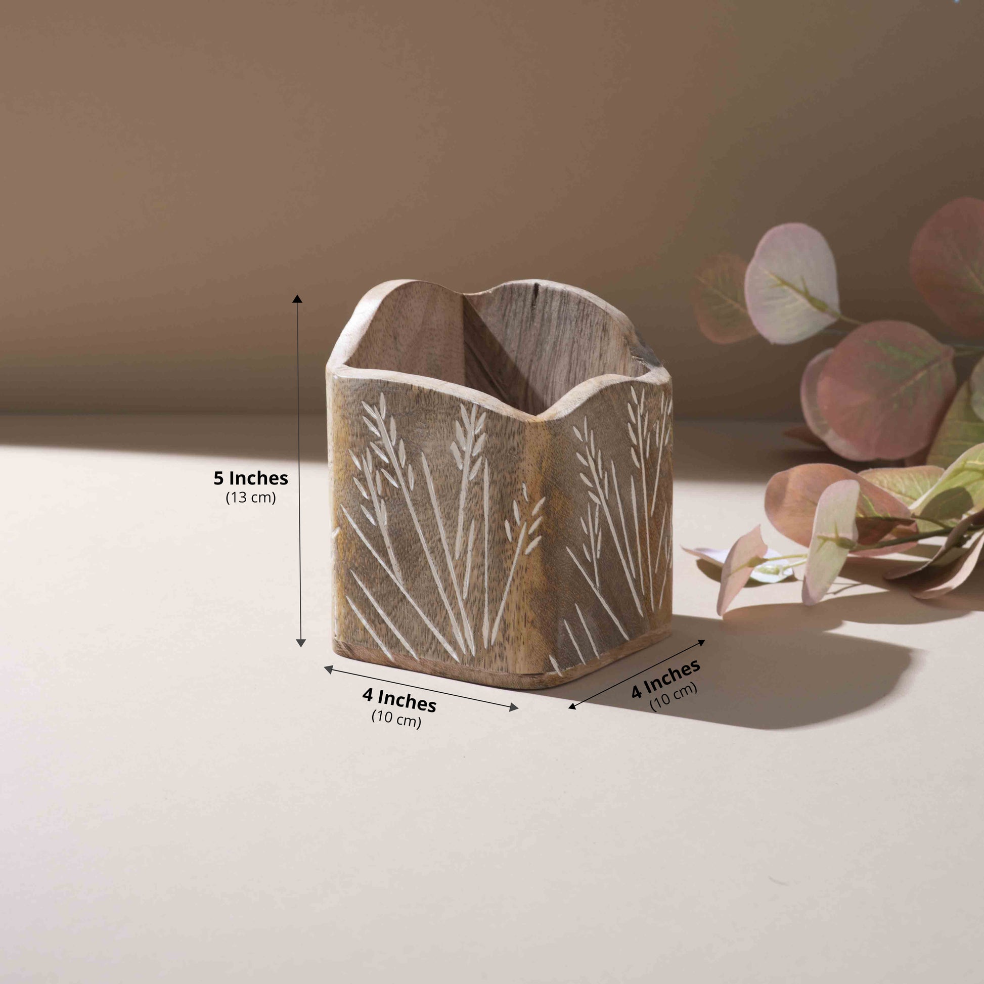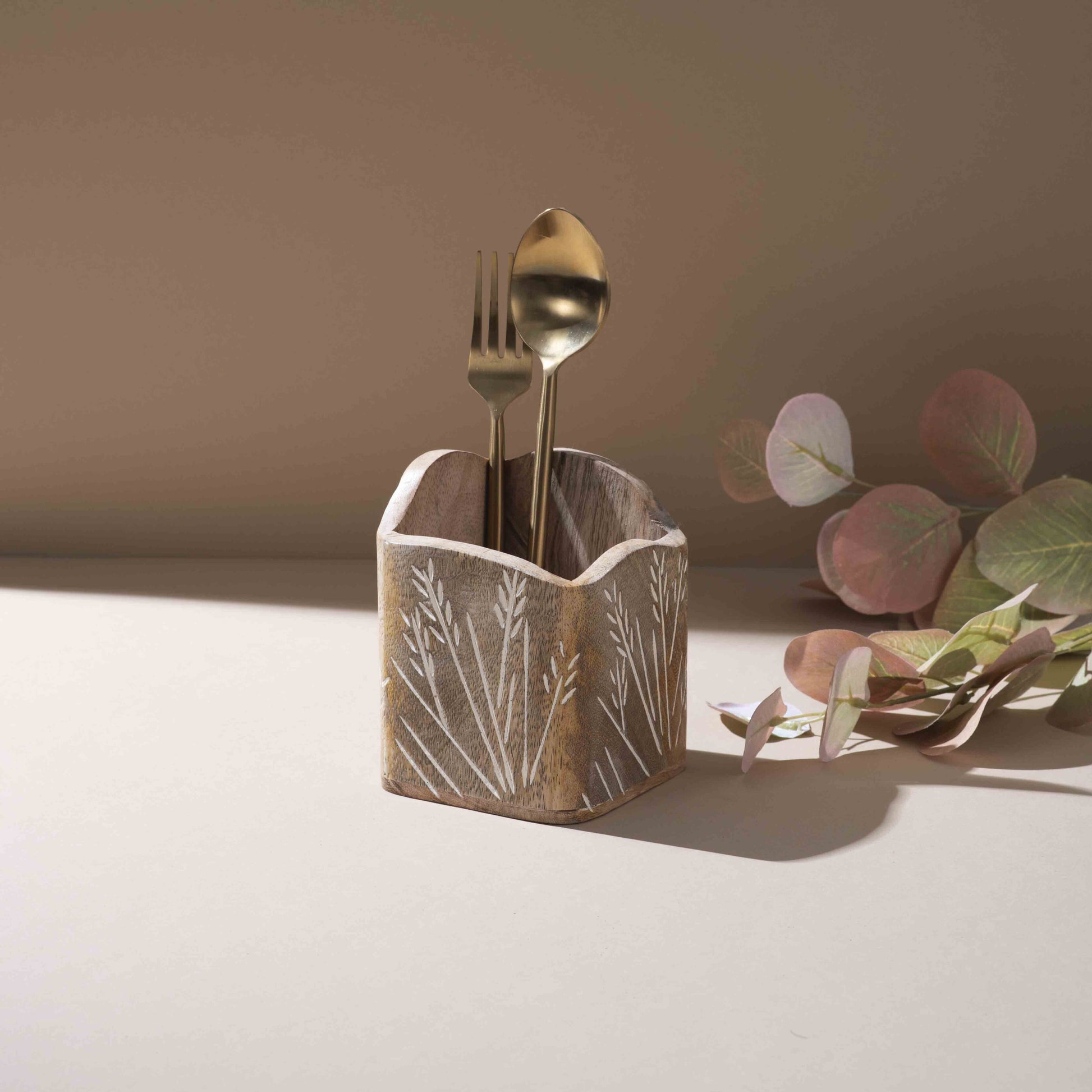 Rustic Leaf-Engraved Wooden Spoon Holder